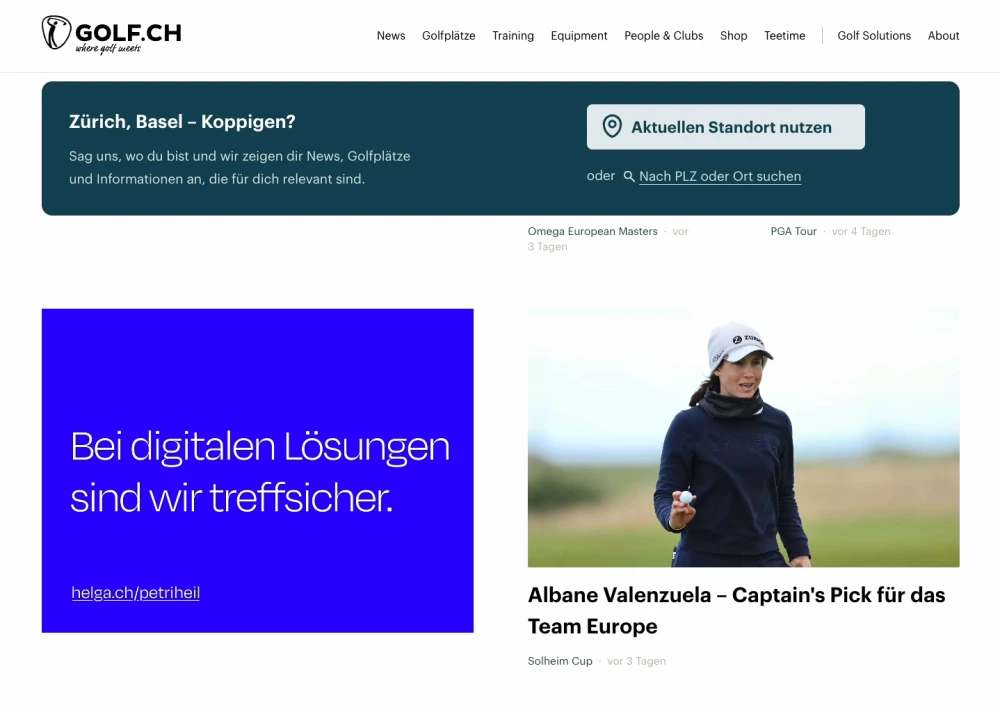 Golf.ch ist auch ein Online-Magazin für Golfreisen, -ausrüstung und -Lifestyle – aber vielmehr noch eine Plattform, die konsequent Mehrwert schafft: mit Golfplatz-Finder, lokalen Inhalten und regional ausgespielter Werbung.